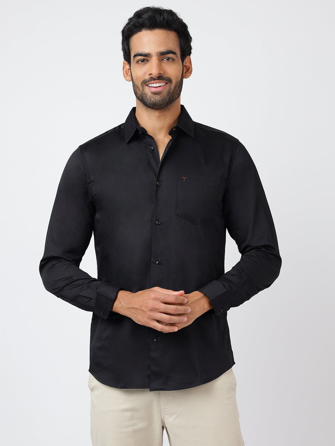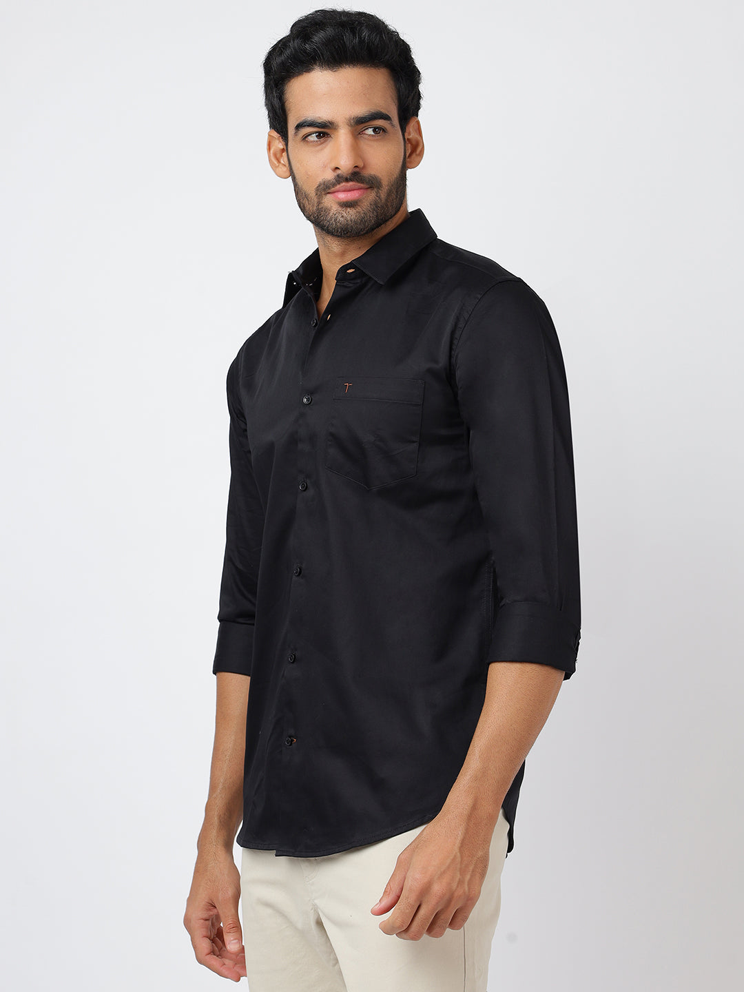 This elegant black long-sleeve shirt, made from pure cotton satin, ensures superior comfort and breathability with its high-quality export-grade fabric. Its minimalist style seamlessly suits both professional settings and chic evening occasions, making it an essential piece for a refined and versatile wardrobe.