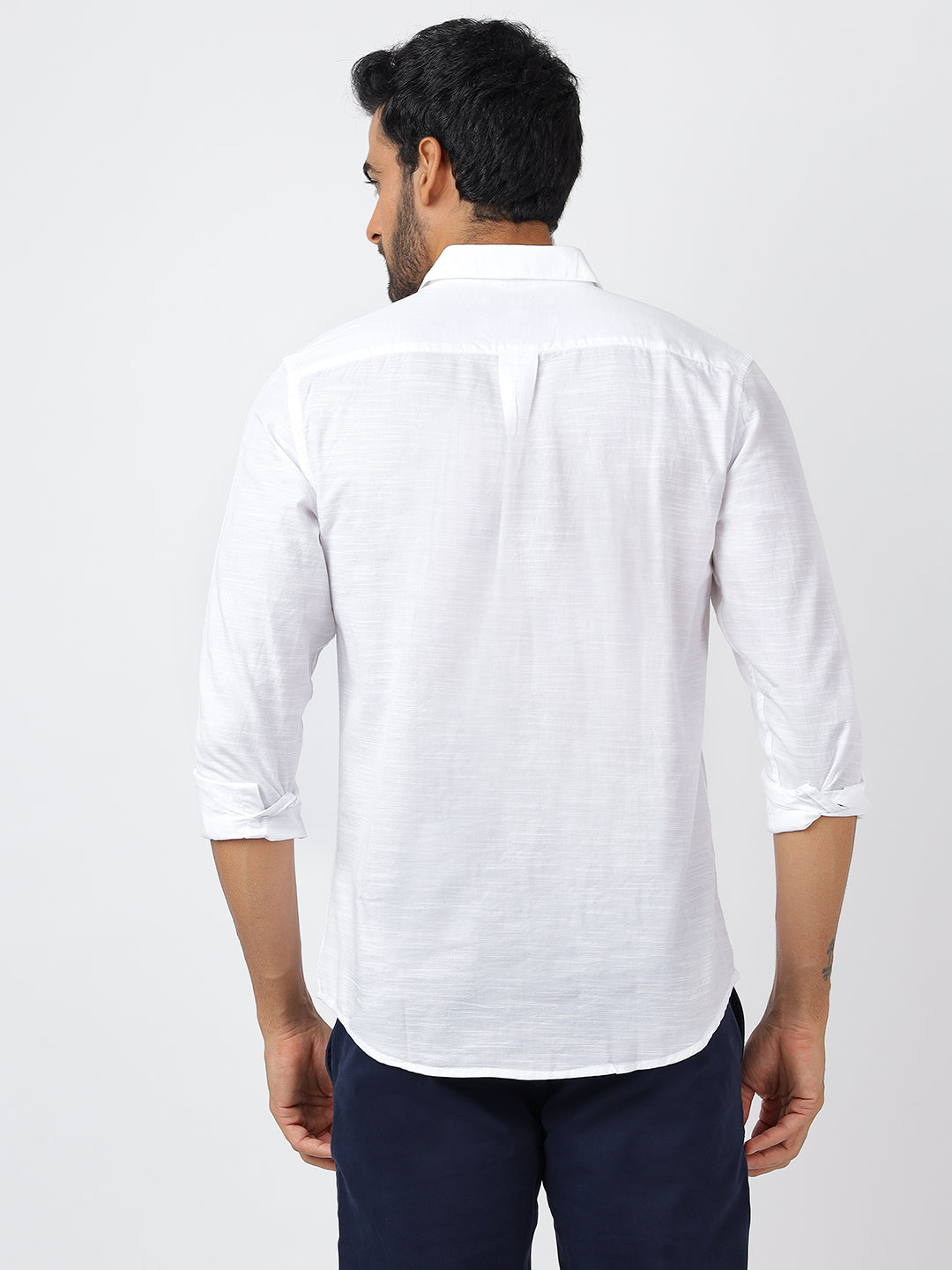 This sophisticated white long-sleeve shirt, crafted from 100% cotton slub twill, delivers exceptional comfort and breathability through its premium export-grade fabric. Its clean, minimalist design is perfect for both formal work environments and elegant evening affairs, making it a must-have for a polished and adaptable wardrobe.